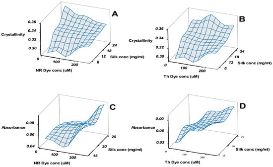 Before the statistical evaluation, some qualitative results can be highlighted. Figure 6A,B compare the change in the FTIR calculated crystallinity (see materials and methods) in each of the samples as a function of silk concentration and dye concentration for NR and Th respectively. Figure 6C,D compares the change in absorbance observed in the new peak as a function of silk concentration and dye concentration.