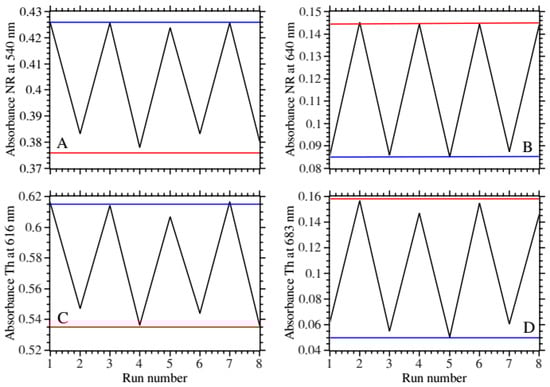 Operational stability: successive monitoring of absorbance and fluorescence in pH 7 and pH 3.5. Panels (A,B): neutral red patch; Panels (C,D): Thionine patch. In all panels the blue line corresponds to the absorbance pH 7 (every odd run number); the red line corresponds to the absorbance at pH 3.5 (every even run number).