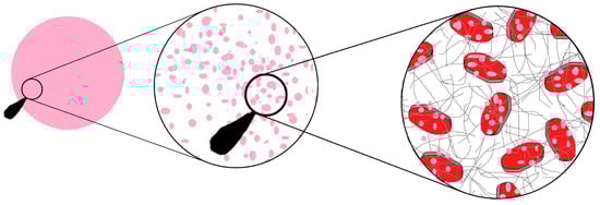 Possible structural organization of a pH-responsive silk patch. Represented are the silk proteins, the Laponite® platelets and on the Laponite® platelets the dye molecules.