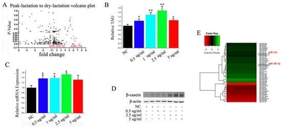 (A) Screening of microRNA (miRNA) expressed at peak-lactation and non-lactating stages. Three mammary samples from goats at each stage of lactation were used; (B) Triglyceride levels in cells treated with increasing concentrations of prolactin; triglyceride levels were compared with controls (n = 6), * p < 0.05; ** p < 0.01; (C) Goat mammary epithelial cells (GMEC) were cultured with prolactin for 48 h, and the expression of β-casein was quantified by RT-qPCR (n = 6), * p < 0.05. All experiments were duplicated and repeated three times. Values are presented as means ± standard errors; (D) Western blot analyses of the expression of β-casein in the prolactin treatment experiments. The effect of prolactin on β-casein protein expression was evaluated by Western blot in GMEC; (E) Screening for miRNAs involves in the 0 µg/mL prolactin and 2.5 µg/mL prolactin, respectively. The expression of 18s rRNA is used as a normalization control.