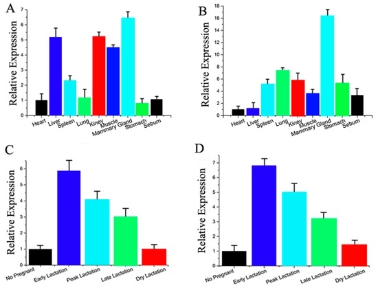 The elite herd of Xinong Saanen dairy goats used in this research was from the experimental farm of Northwest Agricultural and Forestry University of China. Three healthy goats (three years old) with similar body weight were selected at different stages of lactation: non-pregnant, early-lactation (15 days after parturition), peak-lactation (60 days after parturition), late-lactation (150 days after parturition), and non-lactating (“dry” period). All goats gave birth to kids in the second lactation. Spleen, stomach, heart, liver, sebum, mammary gland tissue, muscle, lung, and kidney were collected after slaughter. Three biological samples per tissue were snap-frozen in liquid nitrogen as soon as possible. Using Trizol reagent (Invitrogen, Carlsbad, CA, USA), total RNA was extracted in accordance with the instructions. The quality and quantity of RNA were detected by a ND-1000 spectrophotometer (NanoDrop, Waltham, MA, USA) and the RNA was stored in −80 °C before experimentation. The samples are a mixture of three goats (at the same period) in non-pregnant, early-lactation (15 days after parturition), peak-lactation (60 days after parturition), late-lactation (150 days after parturition), and non-lactating (“dry” period) stages, respectively.