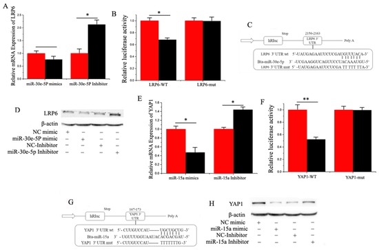 (A) RT-qPCR quantification of the LRP6 expression (n = 6). Red bars represent the negative control; black bars represent miR-30e-5p mimic or inhibitor; (B,C) Target site of miR-30e-5p in LRP63′-UTR and the construction of the luciferase (Luc) expression vector fused with the LRP63′-UTR. WT represents the Luc reporter vector with the WT LRP6 3′-UTR (2155–2163); MU represents the Luc reporter vector with the mutation at the miR-30e-5p site in LRP6 3′-UTR; (D) The effect of miR-30e-5p mimicking and inhibiting LRP6 protein expression was evaluated by Western blot analysis in GMEC; (E) The YAP1 expression level was quantified by RT-qPCR (n = 6). Red bars represent the negative control; black bars represent miR-15a mimic or inhibitor; (F,G) Target site of miR-15a in the YAP13′-UTR and the construction of the luciferase (Luc) expression vector fused with the YAP13′-UTR. WT represents the Luc reporter vector with the WT YAP13′-UTR (167–173); MU represents the Luc reporter vector with the mutation at the miR-15a site in YAP13′-UTR; (H) The effect of miR-15a mimicking and inhibiting YAP1 protein expression was evaluated by Western blot analysis in GMEC. All experiments were duplicated and repeated three times. Values are presented as means ± standard errors, * p < 0.05; ** p < 0.01.