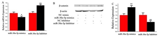 Some studies have shown that LRP6 is an important factor in the Wnt phosphorylation pathway, and β-catenin is an important signal mediating Wnt signaling from molecules to the nucleus [25]. Our initial experiment revealed that LRP6 is a miR-30e-5p’s target gene. To confirm the functional relationship between miR-30e and β-catenin, we examined the mRNA level of β-catenin using RT-qPCR and Western blot. Figure 4A,B show that there was a significant decrease in β-catenin expression in GMEC transfected with a miR-30e-5p mimic in comparison with the control group, indicating that miR-30e-5p did impact the β-catenin expression.