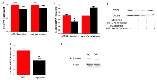 (A) RT-qPCR quantification of the β-catenin expression level (n = 6). Red bars represent the negative control; black bars represent miR-30e-5p mimic or inhibitor; (B) The effect of miR-30e-5p mimicking and inhibiting β-catenin protein expression was evaluated by Western blot analysis in GMEC; (C) GMEC were transfected with miR-30e-5p mimic or inhibitor, and the miR-15a expression level was quantified by RT-qPCR (n = 6). Red bars represent the negative control; black bars represent miR-30e-5p mimic or inhibitor; (D) GMEC were transfected with miR-15a mimic or inhibitor, and the miR-30e-5p expression level was quantified by RT-qPCR (n = 6). Red bars represent the negative control; black bars represent miR-15a mimic or inhibitor; (E) the YAP1 expression level was quantified by RT-qPCR (n = 6). Red bars represent the negative control; black bars represent the miR-30e-5p mimic or inhibitor; (F) The effect of miR-30e-5p mimicking and inhibiting YAP1 protein expression was evaluated by Western blot in GMEC; (G) GMEC were transfected with Si-NC (60 nM) or SiRNA-β-catenin (60 nM) for 48 h, the mRNA expression of YAP1 was quantified by RT-qPCR (n = 6); (H) The effect of Si-NC (60 nM) or SiRNA-β-catenin (60 nM) for 48 h on YAP1 protein expression was evaluated by Western blot in GMEC. All experiments were duplicated and repeated three times. Values are presented as means ± standard errors, * p < 0.05; ** p < 0.01.