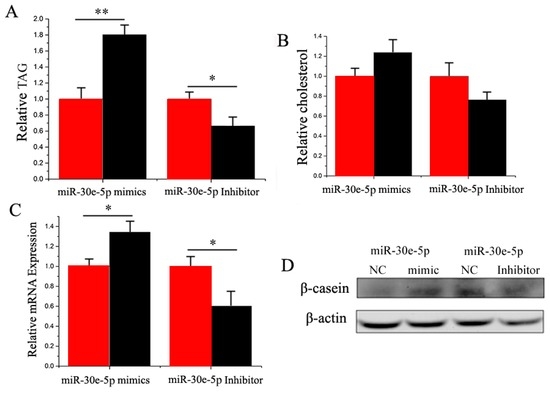 (A) Triglyceride levels in cells transfected with miR-30e-5p mimic or inhibitor; Triglyceride levels in transfected cells compared with miR-30e-5p controls (n = 6). Red bars represent the negative control; black bars represent miR-30e-5p mimic or inhibitor; (B) Cholesterol levels in transfected cells compared with controls (n = 6). Red bars represent the negative control; black bars represent miR-30e-5p mimic or inhibitor; (C) The expression of β-casein was quantified by RT-qPCR (n = 6); (D): The effect of miR-30e-5p mimic or inhibitor on β-casein protein expression was evaluated by Western blot in GMEC. All experiments were duplicated and repeated three times. Values are presented as means ± standard errors, * p < 0.05; ** p < 0.01.