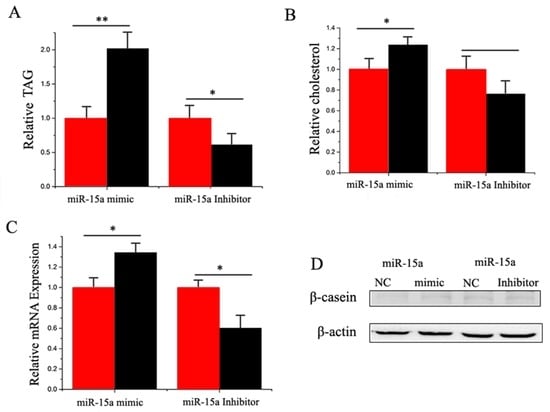 (A) Triglyceride levels in cells transfect with miR-15a mimic or inhibitor; triglyceride levels in transfected cells were compared with that of miR-15a controls (n = 6). Red bars represent the negative control; black bars represent miR-15a mimic or inhibitor; (B) Cholesterol levels in transfected cells were compared with that of control (n = 6). Red bars represent the negative control; black bars represent miR-15a mimic or inhibitor; (C) The expression of β-casein was quantified by RT-qPCR (n = 6); (D) The effect of miR-15a mimic or inhibitor on β-casein protein expression was evaluated by Western blot in GMEC. Total protein was harvested 48 h post-treatment, respectively. All experiments were duplicated and repeated three times. Values are presented as means ± standard errors, * p < 0.05; ** p < 0.01.