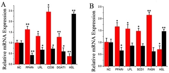 (A) Expression of fatty acid metabolism-related genes. The mRNA expression of PPARγ, LPL, CD36, DGAT1, and HSL was quantified by RT-qPCR (n = 6). Red bars represent the miR-30e-5p mimic; black bars represent the miR-30e-5p inhibitor; (B) Expression of fatty acid metabolism-related genes. The mRNA expression of PPARγ, LPL, SCD1, FASN, and HSL was quantified by RT-qPCR (n = 6). Red bars represent the miR-15a mimic; black bars represent the miR-15a inhibitor. All experiments were duplicated and repeated three times. Values are presented as means ± standard errors, * p < 0.05; ** p < 0.01.