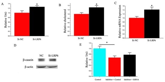 (A) Triglyceride levels in cells transfected with Si-NC or SiRNA-LRP6; triglyceride levels in transfected cells were compared with Si-NC (n = 6). Red bars represent the negative control; black bars represent SiRNA-LRP6; (B) Cholesterol levels in transfected cells were compared with controls (n = 6). Red bars represent the negative control; black bars represent the siRNA-LRP6; (C) The expression of β-casein was quantified by RT-qPCR (n = 6); (D) The effect of si-NC (60 nM) or siRNA-LRP6 (60 nM) on β-casein protein expression was evaluated by Western blot in GMEC; (E) Triglyceride levels in cells transfected with control inhibitor (50 nM) + control siRNA(50 nM), inhibitor 30e-5p (50 nM) + control siRNA (50 nM) and inhibitor 30e-5p (50 nM) + siRNA-LRP6 (50 nM); triglyceride levels were compared with that of controls (n = 6). Values are presented as means ± standard errors, * p < 0.05.