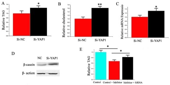 (A) Triglyceride levels in transfected cells were compared with that of control (n = 6). Red bars represent the negative control; black bars represent miR-15a mimic or inhibitor; (B) Cholesterol levels in transfected cells were compared with that of the control (n = 6). Red bars represent the negative control; black bars represent siRNA-YAP1; (C) The expression of β-casein was quantified by RT-qPCR (n = 6); (D) The effect of si-NC (60 nM) or siRNA-YAP1 (60 nM) on β-casein protein expression was evaluated by Western blot in GMEC; (E) Triglyceride levels in cells transfected with control inhibitor (50 nM) + control siRNA (50 nM), inhibitor 15a (50 nM) + Control siRNA (50 nM), and inhibitor 15a (50 nM) + siRNA-YAP1 (50 nM). All experiments were duplicated and repeated three times. Values are presented as means ± standard errors, * p < 0.05; ** p < 0.01.