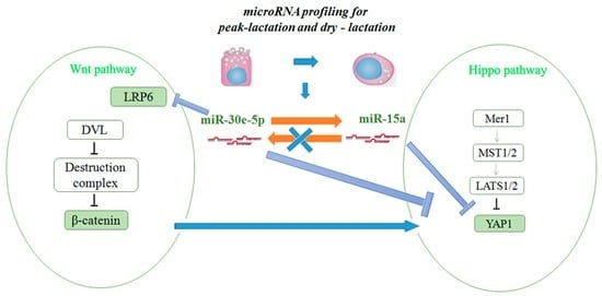 By working in concert with transcription factors, and promoting the expression of certain genes, Yes-associated protein (YAP) and its downstream proteins in the Hippo signaling pathway, play a crucial role in promoting cell growth and inhibiting apoptosis. The protein encoded by LRP6 is a component of the cell-surface receptors for Wnt proteins, and Wnt is known to promote recruitment of Axin via LRP6 all of which leads to inhibiting degradation of β-catenin [25]. Increasing evidence demonstrates that the Hippo/YAP and Wnt/-catenin pathways (crosstalk) control the growth and development of cells, tissues, and organs through various types of interactions [26,27]. Studying the mechanism of the two pathways and the interaction with miRNA will provide a new strategy for regulating milk fat metabolism. Our results revealed that miR-30e-5p and miR-15a are highly-expressed not only in the mammary gland of goats, but also in goat mammary epithelial cells (GMEC) cultured with prolactin. Furthermore, miR-30e-5p cooperates with miR-15a promoting fat metabolism by repressing the expression of YAP1 in GMEC. Our research illustrates that miR-30e-5p and miR-15a play a significant role in the accumulation of milk fat in ruminants.