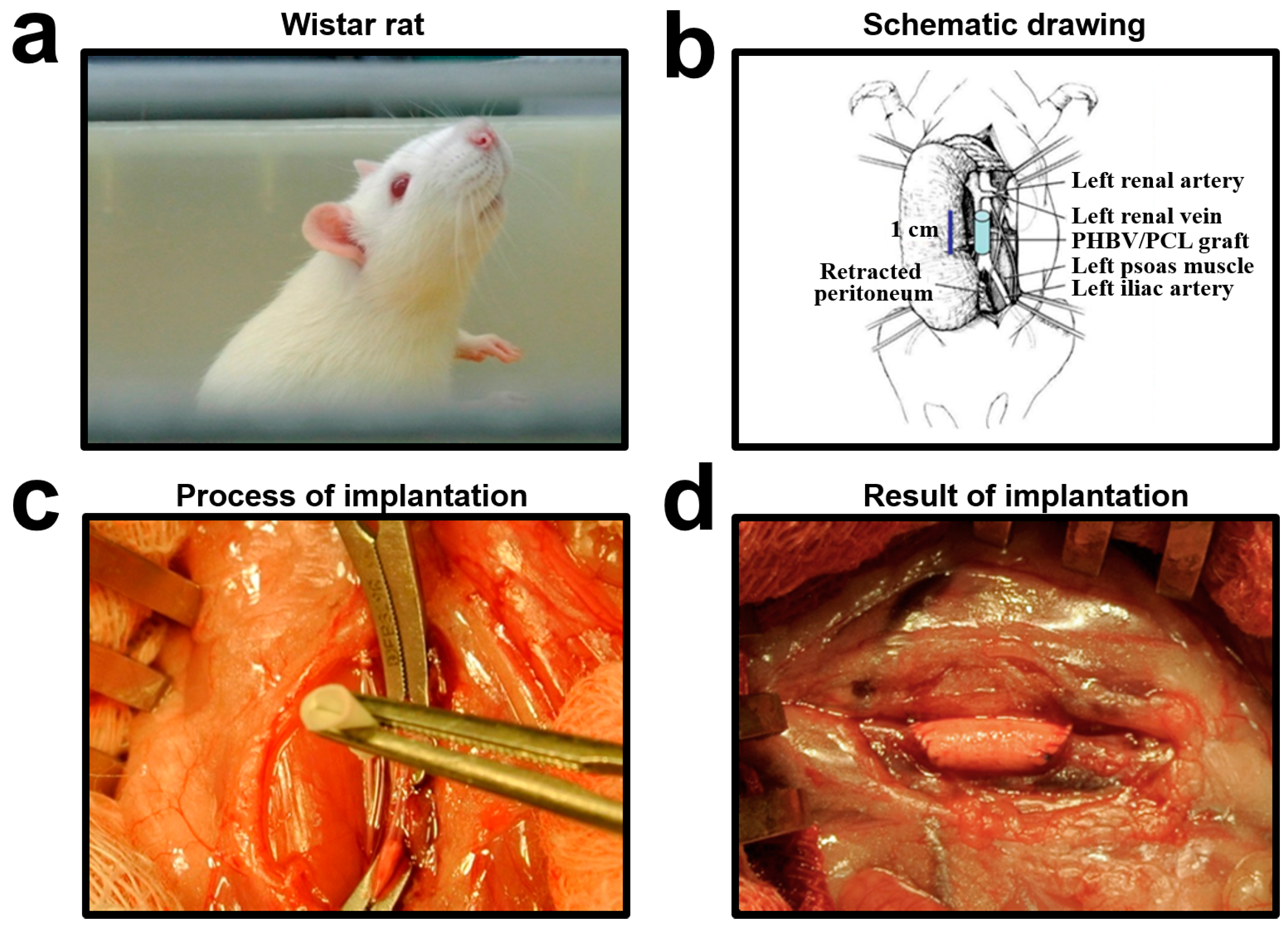 Implantation of the vascular grafts. (a) Wistar rat used for implantation; (b) schematic drawing of the surgery; (c) the process of implantation—aorta is temporarily clamped proximally and distally; (d) implanted graft, the anterior abdominal wall before the closure. PCL: poly(ε-caprolactone); PHBV: poly(3-hydroxybutyrate-co-3-hydroxyvalerate).