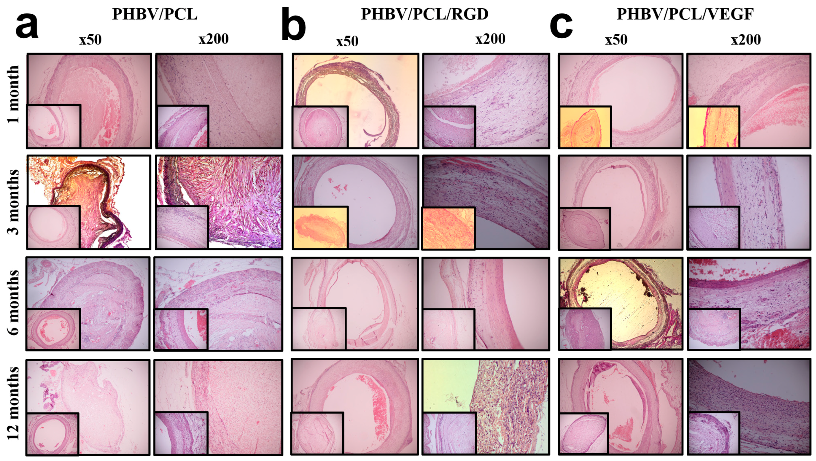 Hematoxylin and eosin (H & E) staining of the unmodified grafts and grafts with either conjugated arginine–glycine–aspartic acid (RGD) peptides or incorporated vascular endothelial growth factor (VEGF) at 1, 3, 6, and 12 months postimplantation; magnification: 50× and 200×. Representative images of: (a) poly(3-hydroxybutyrate-co-3-hydroxyvalerate)/poly(ε-caprolactone) (PHBV/PCL) grafts; (b) PHBV/PCL/RGD grafts; (c) PHBV/PCL/VEGF grafts. Images of corresponding patent PHBV/PCL along with occluded PHBV/PCL/RGD and PHBV/PCL/VEGF grafts are presented as bottom inserts.
