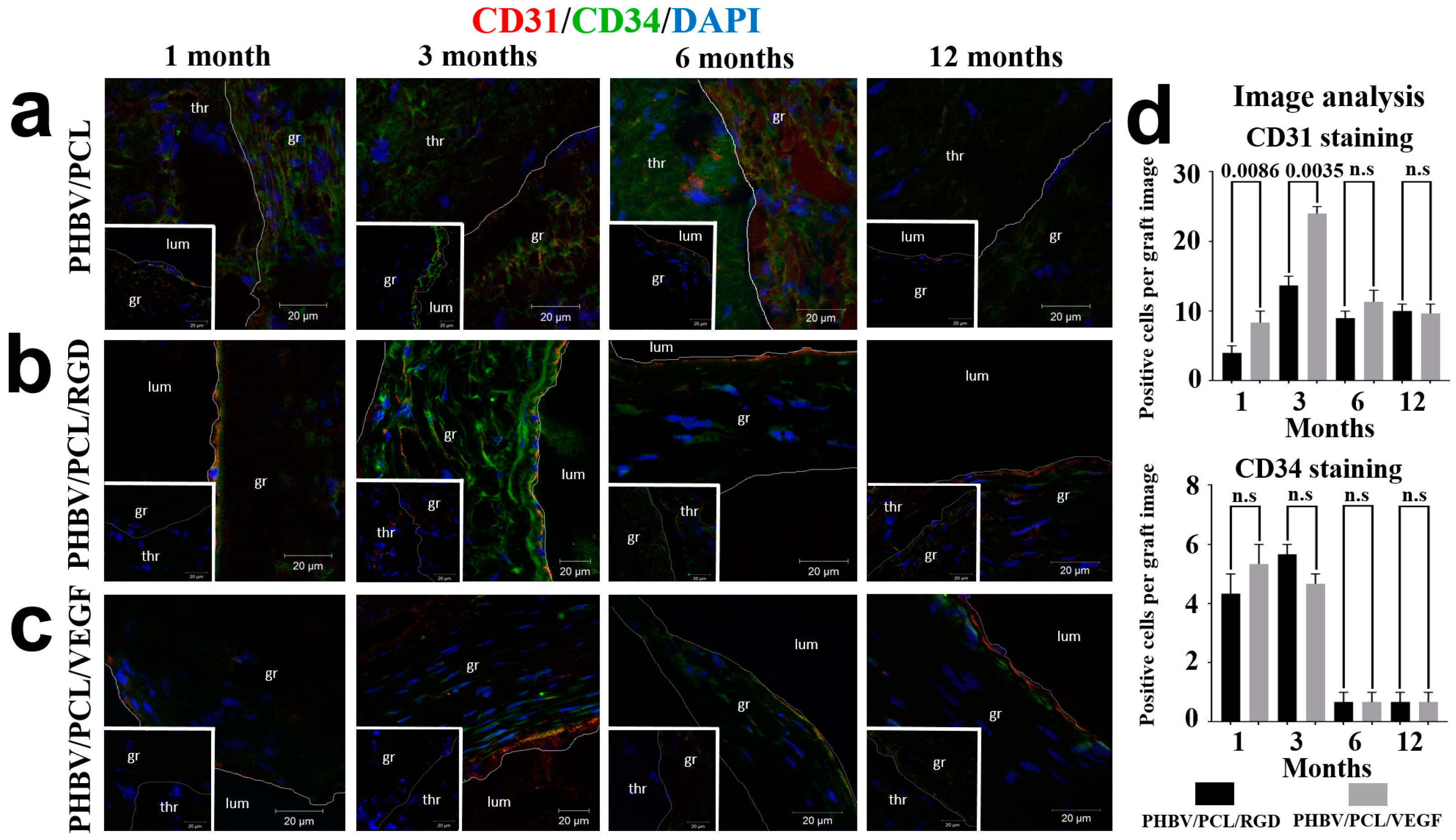 Combined CD31 (red), CD34 (green), and 4′,6-diamidino-2-phenylindole (DAPI, blue) staining. Representative images of: (a) PHBV/PCL grafts; (b) PHBV/PCL/RGD grafts; (c) PHBV/PCL/VEGF grafts. Thr is for thrombus, gr is for graft, lum is for lumen. Images of corresponding patent PHBV/PCL along with occluded PHBV/PCL/RGD and PHBV/PCL/VEGF grafts are presented as bottom inserts; (d) Quantitative image analysis, data are represented as mean with range, p-values are reported in a numerical manner, n.s. is for not significant, two-tailed Student’s t-test. Non-modified PHBV/PCL grafts were not included into analysis, since they were devoid of CD31+ and CD34+ cells.