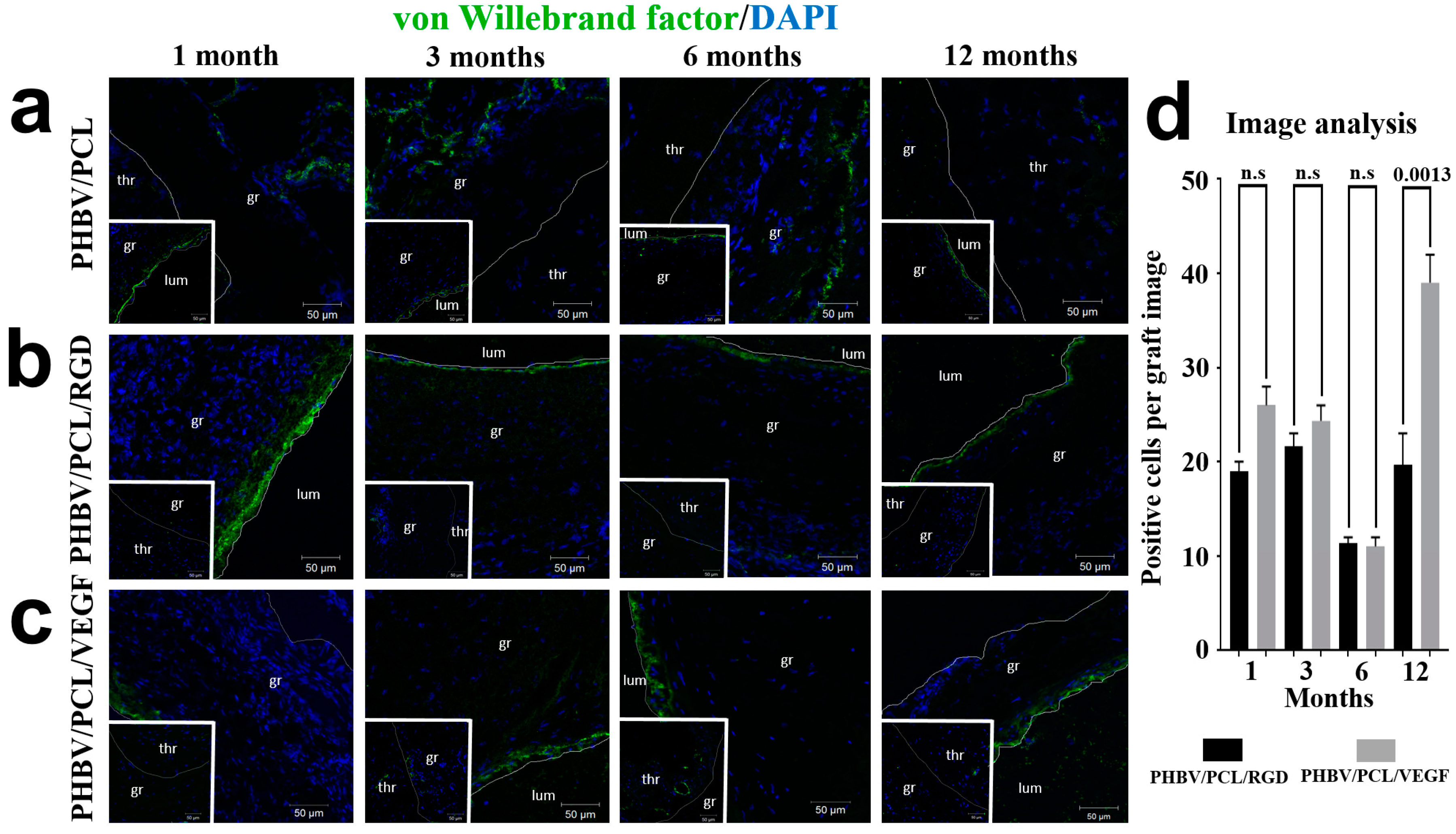 Combined von Willebrand factor (vWF, green) and DAPI (blue) staining. Representative images of: (a) PHBV/PCL grafts; (b) PHBV/PCL/RGD grafts; (c) PHBV/PCL/VEGF grafts. Thr is for thrombus, gr is for graft, lum is for lumen. Images of corresponding patent PHBV/PCL along with occluded PHBV/PCL/RGD and PHBV/PCL/VEGF grafts are presented as bottom inserts; (d) Quantitative image analysis, data are represented as mean with range, p-values are reported numerically, n.s. is for not significant, two-tailed Student’s t-test. Non-modified PHBV/PCL grafts were not included in the analysis, since their luminal surface was devoid of vWF+ cells, while the single positive cells within the graft wall were irrelevant for the assessment of endothelialization.