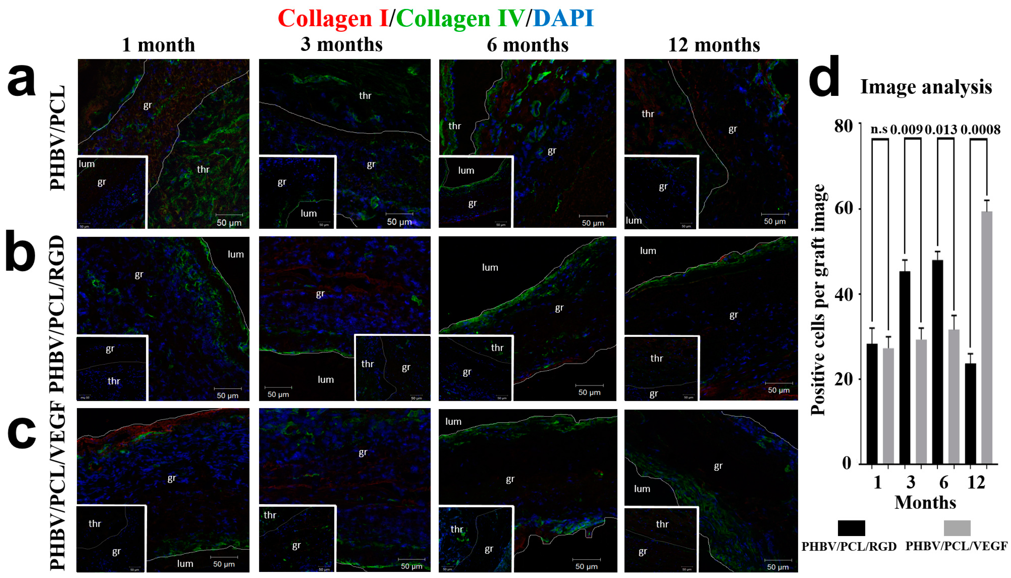 Combined collagen I (red), collagen IV (green), and DAPI (blue) staining. Representative images of: (a) PHBV/PCL grafts; (b) PHBV/PCL/RGD grafts; (c) PHBV/PCL/VEGF grafts. Thr is for thrombus, gr is for graft, lum is for lumen. Images of corresponding patent PHBV/PCL along with occluded PHBV/PCL/RGD and PHBV/PCL/VEGF grafts are presented as bottom inserts; (d) Quantitative image analysis, data are represented as mean with range, p-values are reported numerically, n.s. is for not significant, two-tailed Student’s t-test. Non-modified PHBV/PCL grafts were not included in the analysis, since their luminal surface was devoid of collagen I+ or collagen IV+ cells, while the single positive cells within the graft wall were irrelevant for the assessment of endothelialization.