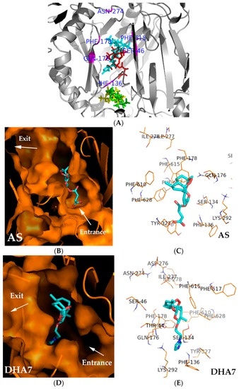 The binding pocket of AS and DHA7 was lined by hydrophobic (Phe136, Phe178, and Phe615) and polar (Gln176, Ser46, and Tyr327) residues, which were partially overlapped with those of substrates such as minocycline and doxorubicin [