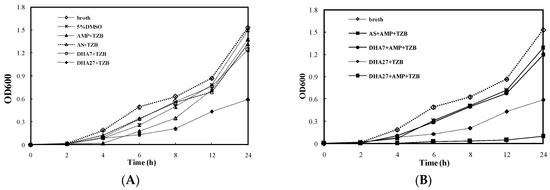 Bacteria in the exponential phase of growth were diluted in LB broth to reach a concentration of 1.0 × 106 cfu/mL. According to the MIC results, the same concentrations of AS, DHA7, and DHA27 alone, and in combination with AMP were added to bacterial suspensions. Broth and 5% dimethyl sulfoxide (DMSO) were used without drugs or antibiotic. The bacterial growth was determined by measuring OD600 at regular intervals.