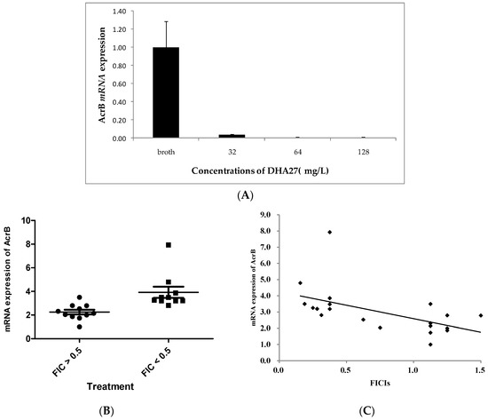 E. coli AG100A lacking AcrA and AcrB and AG100A/pET28a-AcrB re-expressing AcrB, the recombinant AG100A harboring pET28a-AcrB, were used. The results showed that both DHA27 and PAβN lost the enhancement of AMP against E. coli AG100A and regained it against E. coli AG100A/pET28a-AcrB, which demonstrated that DHA27 should be an AcrB inhibitor. Moreover, DHA27 alone markedly reduces acrB’s mRNA expression of E. coli ATCC 35218 in a dose-dependent manner and its antibacterial enhancement activity is related to the degree of acrB mRNA expression in E. coli clinical strains, which further indicated that DHA27 was an AcrB inhibitor.