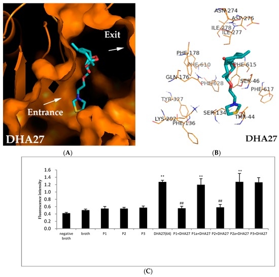 Figure 5A,B). Nile red is only a weakly fluorescent in aqueous solution, but undergoes a significant increase in fluorescent quantum yield when in nonpolar environment such as the cell membrane. Cells were preloaded with nile red in the absence or presence of DHA27. Once the cells were energized by the addition of glucose, the efflux of nile red could be observed as a drop in fluorescence. The result was similar to that from daunorubicin accumulation assay. DHA27 could inhibit the efflux of nile red just like AcrB inhibitor PAβN (