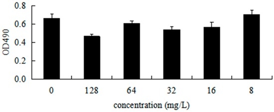 RAW264.7 cells of logarithmic phase were adjusted to the concentration of 8 × 104 cells per milliliter with the Dulbecco’s modified Eagle’s medium (DMEM) (10% fetal bovine serum) culture. The cells were placed on a 96-well plate (180 µL/well) and cultivated in a 37 °C, 5% CO2 incubator for 24 h. DHA27 (20 µL/well) was added to achieve the final concentrations of 128, 64, 32, 16, and 8 mg/L. The blank culture was set up for control, and then the template was put in the 37 °C, 5% CO2 incubator for 24 h. A mixture of 100 μL of low-glucose DMEM and 20 μL of MTS solution was added per well. The plate was placed in an incubator at 37 °C for 1 h at 5% CO2. The absorbance was measured at 490 nm. All data were presented as mean ± standard deviation (n = 5).