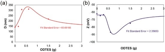 Evolution of (a) average diameter (D) and (b) ζ potential (Z) of the water dispersed particles, depending on the amount of octadecyltriethoxysilane (ODTES) added in the sol–gel system (The lines are for guiding the reader. The experimental data were plotted, and the given curve was fitted with Table Curve 2D version v5.01 software. The fit standard error calculated by the software is written inside each chart).