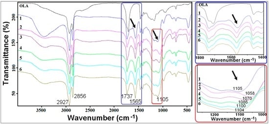 Additionally, the asymmetric and symmetric stretching bands of CH2 groups around 2925 and 2857 cm−1 can be identified. The spectrum of pristine oleic acid shows a specific band at 1710 cm−1, caused by the C=O stretching vibration [26]. For the hybrid silica (Samples 1–6), this band is shifted to ~1736 cm−1, indicating a carboxylate interaction with a Na+ cation from sodium silicate. Moreover, a new band appears at ~1565 cm−1, assigned to COO− stretching, proving the formation of the OLA/OLANa complex (the oleic acid and its sodium salt resulted from the interaction of the polar head-group of the oleate molecules with sodium cation) [26,27].