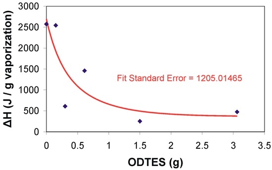 The decrease in water evaporation enthalpy from the silica dispersions with the increase in the degree of ODTES alkylation indicates a weak interaction of the water existing in the system with the molecular aggregates formed by the interaction of octadecyl and oleate chains. Our results are in good agreement with previously published data, where the decrease in water evaporation enthalpy along with the increase in the concentration of other hydrophobic groups is emphasized (e.g., amino acids [28], perflouorosulfonated membrane [29], polystyrene latexes [30], and polyvinyl alcohol [31]).