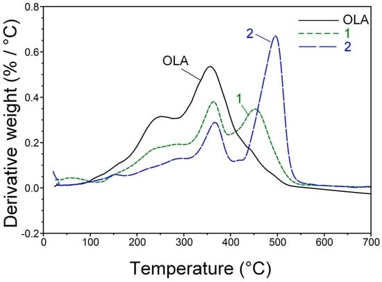 To obtain new information regarding the hydrocarbon chains from the dried hybrids, thermal degradation was performed, and the weight loss (TGA) and the thermal effects that follow these degradations were simultaneously observed (DSC). The DTA curves of the pristine OLA and of Samples 1 and 2, shown in Figure 4, are useful to delimit the temperature domains in which thermo-destruction occurs.
