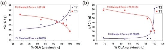 Results represented in Figure 5 reveal a significant modification of OLA in the presence of silica. The weight losses, as well as the decomposition enthalpies, are different from those of the pure OLA. Variation in weight losses in the two temperature ranges 200–400 °C (T2) and 400–700 °C (T3) is represented in Figure 5a. Therein, an increase in weight losses for T2 together with an increase in gravimetric percentage of OLA (g OLA/g (OLA + C18) ×100) can be observed. Furthermore, a decrease in weight losses for T3 with an increase in the OLA fraction can also be observed.