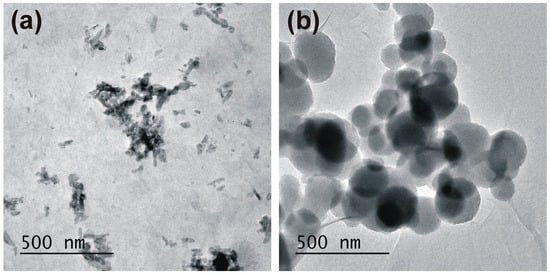 TEM images of (a) the octadecyl-modified silica particles witha 1:1 ODTES/sodium silicate molar ratio (Sample 2) and (b) the octadecyl-modified silica particles with an ODTES/sodium silicate molar ratio = 1:10 (Sample 5).