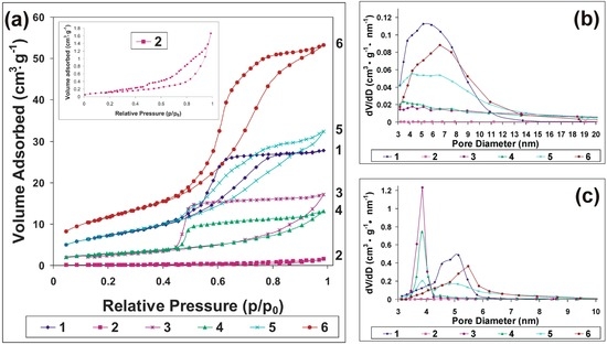 Thus, for Sample 1, only mesopores and no macropores are formed. For Samples 5 and 6, the asymmetric region above 0.8 p/p0 reflects wide (secondary) mesopores with sizes >10 nm that do not necessarily have a significant volume [32]. Samples prepared with a high amount of ODTES shows very different size distribution curves for adsorption and desorption branches. For Sample 2, even if pore sizes of ~3.5 nm could be calculated by the BJH method from the adsorption branch, a much smaller surface area (~3 m2/g) and total pore volume (0.017 cm3/g) were measured, likely due to the incomplete calcination of the organic components of the hybrids.