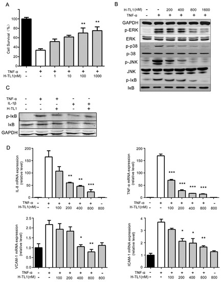 H-TL1 reduced the effects of TNF-α in vitro: (A) H-TL1 improved survival in TNF-α-treated L929 cells; (B) H-TL1 inhibited the TNF-α-induced phosphorylation of p38 (Thr180/Tyr182), ERK (Thr202/Tyr204), JNK (Thr183/Tyr185), and IκB (Ser32/36) within the NF-κB and MAPKs signaling pathways; (C) H-TL1 failed to inhibit the phosphorylation of IκB induced by IL-1β; and (D) H-TL1 inhibited TNF-α-mediated expression of pro-inflammatory factors. HEK293 cells were stimulated with TNF-α (20 ng/mL) for 10 min with graded concentrations of H-TL1. Values represent means ± SEM (A: n = 5; D: n = 3), * p < 0.05, ** p < 0.01 and *** p < 0.001 vs. TNF-α group.