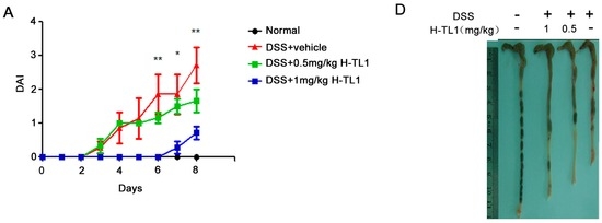 The clinical disease activity index (DAI, Table 1) was monitored daily for the entire experiment. As shown in Figure 3A, DSS administration significantly induced diarrhea, rectal bleeding, and weight loss. However, by Days 6–8, the DAI significantly decreased in mice administered 1 mg/kg H-TL1 intraperitoneally once daily (* p < 0.05, ** p < 0.01). By Day 8, the DSS + vehicle-treated mice lost an average of 4.3 g more than the normal group (without DSS). However, mice treated with H-TL1 were protected from this effect, experiencing only a 1.6 g loss of body weight. Further, DSS + H-TL1 (1 mg/kg) mice recovered, appearing similar in health to that of the normal group (Figure 3B). In addition, the spleen/body weight ratio was significantly lower in the group treated with 1 mg/kg of H-TL1 than that of mice treated with DSS alone (* p < 0.05, Figure 3C); however, the 0.5 mg/kg dose did not significantly prevent losses in body weight.