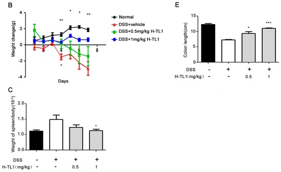 H-TL1 ameliorated DSS-induced colitis: (A) Effect of H-TL1 on DAI induced by DSS. DAI (fecal bleeding, diarrhea, and weight loss) was monitored for eight days; (B) Effect of H-TL1 on body weight of mice with DSS-induced acute colitis. Values represent means ± SEM (n = 8), * p < 0.05 and ** p < 0.01 vs. DSS group (upper panels) for group treated with H-TL1 (1 mg/kg); * p < 0.05 vs. DSS group (lower panels) for group treated with H-TL1 (0.5 mg/kg); (C) Effects of H-TL1 on spleen/body weight ratio in mice with DSS-induced acute colitis; (D,E) Effects of H-TL1 on colon length in mice with DSS-induced acute colitis. The DSS-negative group was considered normal. In (A,C,E), values represent means ± SEM (n = 8), * p < 0.05, ** p < 0.01, and *** p < 0.001 vs. DSS group.