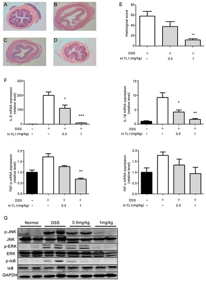 The effect of H-TL1 on inflammatory parameters: histological score, cytokines, and signaling pathways: (A) normal mucosa of BALB/c mouse; (B) severe inflammation, including complete destruction of epithelial architecture with loss of crypts and epithelial integrity, submucosal edema, and extensive inflammatory cellular infiltration in DSS + vehicle mice; (C) treatment with 0.5 mg/kg H-TL1 had little effect on DSS-induced colonic inflammation; (D) treatment with 1 mg/kg H-TL1 alleviated DSS-induced colonic inflammation; (E) histological score of DSS-induced colonic inflammation in mice treated with vehicle or H-TL1; (F) H-TL1 treatment reduced mRNA expression of inflammatory mediators; and (G) H-TL1 inhibited DSS-induced NF-κB and MAPK activation through phosphorylation of ERK(Thr202/Tyr204), JNK (Thr183/Tyr185), and IκB (Ser32/36). Values represent means ± SEM (E: n = 8; F: n = 3), * p < 0.05, ** p < 0.01, and *** p < 0.001 vs. DSS only group. H&E (hematoxylin and eosin) staining, 40× magnification.