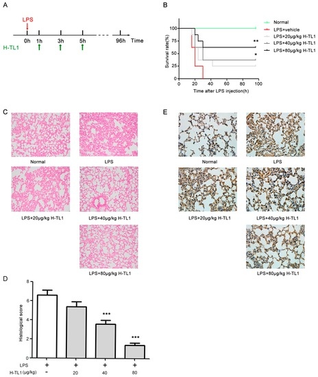 Protective effects of H-TL1 against LPS-induced acute shock in mice: (A) timeline of acute septic shock mouse model and treatment with H-TL1; (B) survival rates of mice were measured within 96 h. Group without LPS was considered normal, * p < 0.05 and ** p < 0.01 vs. LPS group (log-rank test); (C) effects of H-TL1 on LPS-induced lung tissue histological damage; (D) histological score of lung tissue samples; and (E) effects of H-TL1 on LPS-induced expression of TNF-α in lung tissue samples. Values represent means ± SEM (n = 8), *** p < 0.001 vs. LPS group (ANOVA). H&E staining, 200× magnification; IHC, 400× magnification.