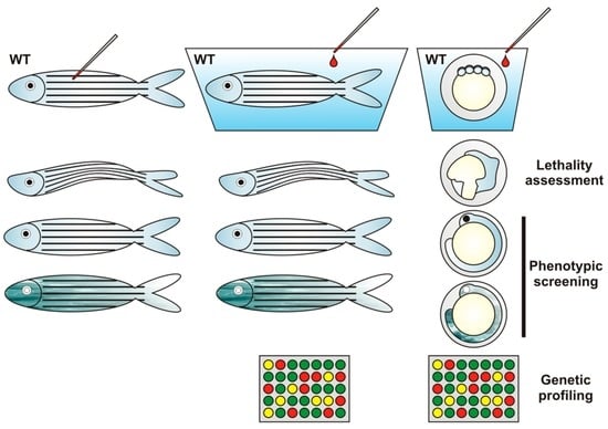 Zebrafish as a tool for toxicological studies. In classical toxicology research, an excessive or non-excessive (e.g., environmentally relevant) dose of the tested compound is administered to an animal e.g., via injection, dietary or waterborne uptake. Evaluation of tested chemical toxicity can be based on various approaches such as lethality assessment, phenotypic screening or gene profiling. Phenotypic screening involves the monitoring of different parameters, e.g., endocrine disrupting compounds (EDCs) can be identified via gonadal morphology and histological comparative analysis. Gene profiling is used in so-called toxicogenomics due to the organism’s susceptibility to different chemicals manifested in the induction of genes, e.g., involved in detoxification or protection against cellular stresses. This method of toxicant identification consists of the assessment of changes in gene-expression profiles by the use of oligonucleotide microarray. Of note, the sensitivity of this assay system is high enough to detect a distinct compound at a concentration that does not cause morphological effects. WT, wild type.
