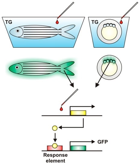 Biotechnological techniques allow one to avoid many of these problems through the generation of zebrafish transgenic lines carrying reporter genes such as green fluorescent protein (GFP), a way to improve the sensitivity and efficacy of detection of various toxicants [91] (Figure 2). These genetically modified lines play the role of excellent biosensors which, due to the use of specific genetic regulatory elements to drive the expression of fluorescent proteins, provide both the possibility for demonstration of the tissue-specific mode of toxicants’ action and the presence of target classes of pollutants [88,92,93]. Moreover, biosensors enable assessment of different compounds’ toxicity at relatively low doses corresponding to ecologically relevant concentrations.