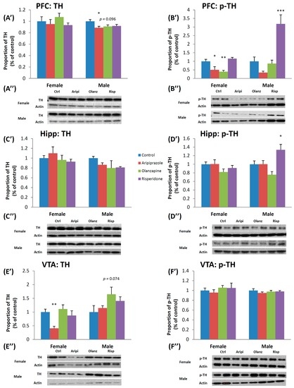 Effects of three APDs on TH and p-TH expression levels in the PFC (TH: (A’,A”); p-TH: (B’,B”)), Hipp (TH: (C’,C”); p-TH: (D’,D”)) and VTA (TH: (E’,E”); p-TH: (F’,F”)) of female and male rats. Sprague-Dawley rats were treated chronically with Aripiprazole (1.0 mg/kg, t.i.d), Olanzapine (1.0 mg/kg, t.i.d), Risperidone (0.3 mg/kg, t.i.d) or control (vehicle). Data expressed as mean ± SEM. * p < 0.05, ** p < 0.01, *** p < 0.001 vs. control. The representative bands of Western Blot are shown. APD: Antipsychotic drug; Hipp: Hippocampus; p-TH: Phosphorylated-tyrosine hydroxylase; PFC: Prefrontal cortex; t.i.d.: Three times daily; TH: Tyrosine hydroxylase; VTA: Ventral Tegmental Area.