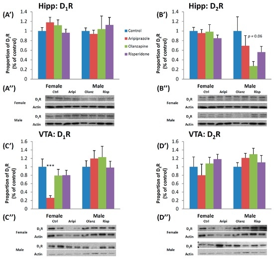 Effects of three APDs on D1 and D2 receptor expression levels in the Hippocampus (D1R: (A’,A”); D2R: (B’,B”)) and VTA (D1: (C’,C”); D2: (D’,D”)) of female and male rats. Sprague-Dawley rats were treated chronically with Aripiprazole (1.0 mg/kg, t.i.d), Olanzapine (1.0 mg/kg, t.i.d), Risperidone (0.3 mg/kg, t.i.d) or control (vehicle). Data expressed as mean ± SEM. *** p < 0.001 vs. control. The representative bands of Western blot are shown. APD: Antipsychotic drug; Hipp: Hippocampus; t.i.d.: Three times daily; VTA: Ventral Tegmental Area.