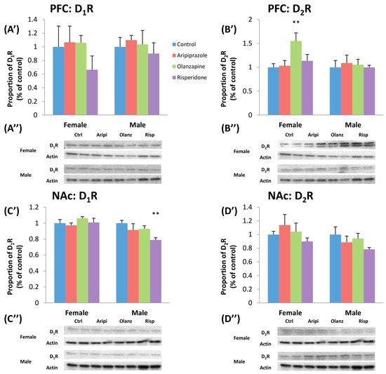 Effects of three APDs on D1 and D2 receptor (D1R and D2R) expression levels in the PFC (D1R: (A’,A”); D2R: (B’,B”)) and NAc (D1R: (C’,C”); D2R: (D’,D”)) of female and male rats. Sprague-Dawley rats were treated chronically with Aripiprazole (1.0 mg/kg, t.i.d), Olanzapine (1.0 mg/kg, t.i.d), Risperidone (0.3 mg/kg, t.i.d) or control (vehicle). Data expressed as mean ± SEM. ** p < 0.01 vs. control. The representative bands of Western blot are shown. APD: Antipsychotic drug; NAc: Nucleus Accumbens; PFC: Prefrontal cortex; t.i.d.: Three times daily.