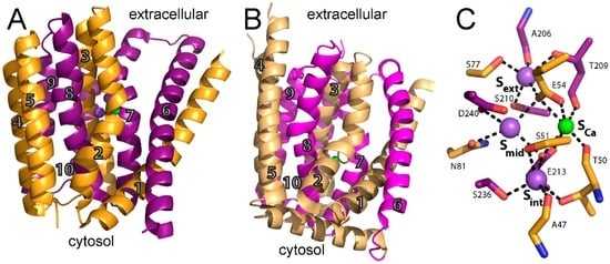 - Nishizawa, T.; Kita, S.; Maturana, A.D.; Furuya, N.; Hirata, K.; Kasuya, G.; Ogasawara, S.; Dohmae, N.; Iwamoto, T.; Ishitani, R.; et al. Structural basis for the counter-transport mechanism of a H+/Ca2+ exchanger. Science 2013, 341, 168–172. [Google Scholar] [CrossRef] [PubMed]