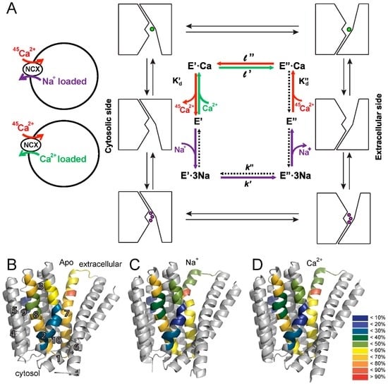 - Liao, J.; Marinelli, F.; Lee, C.; Huang, Y.; Faraldo-Gomez, J.D.; Jiang, Y. Mechanism of extracellular ion exchange and binding-site occlusion in a sodium/calcium exchanger. Nat. Struct. Mol. Biol. 2016, 23, 590–599. [Google Scholar] [CrossRef] [PubMed]