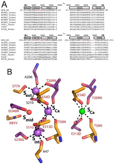 Ion selectivity of NCX. (A) sequence alignment of the α-repeats of NCX_Mj and members of the Na+/Ca2+-K+ exchanger (NCKX), Ca2+/H+ exchanger (CAX) and mitochondrial Na+/Ca2+ exchanger (NCLX) families. Ion-coordinating residues are red; (B) 3Na+ ions (purple spheres, 5HXE) coordination and 1Ca2+ ion (green sphere, 5HXR) coordination as suggested by the crystal structures of NCX_Mj. Mutated residues in the NCX_Mj/NCLX construct are red.