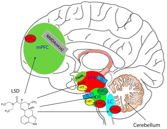 The final pathways of the serotonergic, dopaminergic, TAAR1 and glutamatergic activation by LSD is the Prefrontal Cortex (PFC). Projections from DR nuclei, VTA and LC end in the PFC promoting or blocking the release of neurotransmitters []. Indeed, the PFC contains pyramidal glutamatergic neurons that are modulated by several systems as well as γ-aminobutyric acidergic (GABA) interneurons and dopaminergic, noradrenergic, serotonergic, glutamatergic and cholinergic neurotransmitters. Any change in these systems in the PFC could lead to the development of altered behavioural phenotypes []. Most of the psychotic and cognitive effects of LSD are probably mediated by the PFC []. However, further research should be addressed to explore the involvement of PFC in the mechanism of LSD.