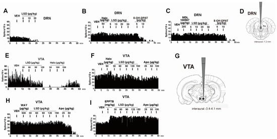 Representative integrated firing rate histograms showing the effects of intravenous LSD administration on the firing rate of dorsal raphe nucleus (DRN) serotonin (5-HT) neurons and of ventral tegmental area (VTA) dopamine (DA) neurons (modified from De Gregorio et al. 2016, with permission []): (A) LSD (5–20 µg/kg) decreases DRN 5-HT neurons; (B) Haloperidol (halo, 50 µg/kg); and (C) MDL 100 907 (200 µg/kg) prevent the inhibitory effect of LSD on DRN 5-HT neurons; (D) illustration portrays a coronal brain section (Paxinos and Watson, 1986 []) containing the DRN, the boxed area encompassing the DR represents the location where most putative 5-HT neurons were found; (E) LSD (30–120 µg/kg) decreased VTA DA neurons: (F) Haloperidol (halo, 50 µg/kg) prevents the inhibitory effect of LSD on VTA DA neurons (G) illustration portrays a coronal brain section (Paxinos and Watson, 1986) containing the VTA; (H) WAY 100 907 (WAY, 200 µg/kg); and (I) EPPTB (5 mg/kg) prevent the inhibitory effect of LSD on VTA DA neurons.