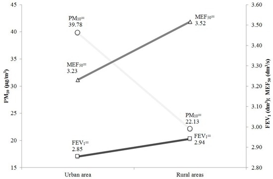 Taking into account that the difference in the five-year mean concentration of PM10 in the considered city and rural areas was over 17 μg/m3, each increase of PM10 by 10 μg/m3 is associated with a decline in FEV1 of 1.68%, in PEF of 1.18% and in MEF50 of 4.61%, considering that the last two parameters have less clinical relevance in terms of the influence on air pollution (selected results are presented in Figure 1). The differences in the concentrations of PM10 and in the spirometric parameters between the groups were statistically significant, which confirms that traffic and its air pollutants may have a substantial influence on the pulmonary function of people living in particularly polluted areas.