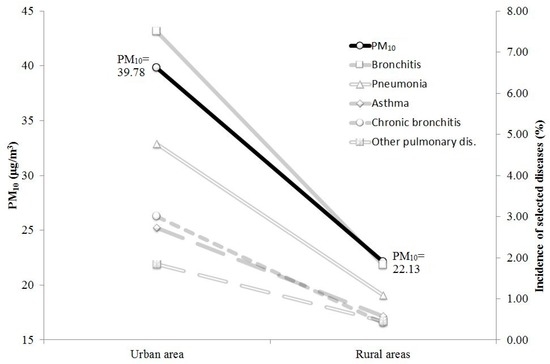 It also seems that the exposure to higher concentrations of PM10 may have an influence on the incidence of respiratory diseases. In the city group, according to the results of the Fisher-Snedecor test, the proportion of the incidence of considered diseases was statistically significantly higher in comparison to the control group (Figure 2).