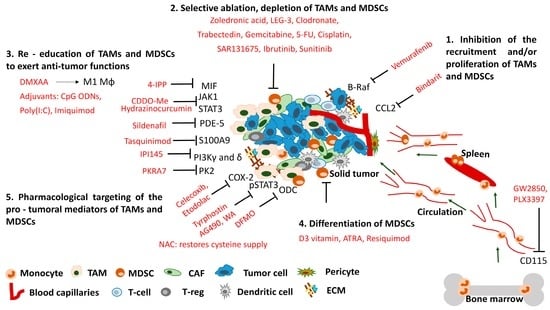 Small molecule-based therapeutic strategies to target TAMs and MDSCs in the tumor microenvironment. Solid tumor microenvironment constitutes a variety of cellular (MDSC, TAM, CAF, T-reg) and molecular stromal components (ECM) which hamper anti-tumor therapeutic response. We summarize current small molecule therapeutics (red) targeting TAMs and MDSCs. Possible therapeutic approaches include: (1) inhibition the recruitment and/or proliferation of monocytes/macrophages; (2) their selective ablation or (3) re-education to tumoricidal rather than tumor promoting; (4) differentiate immature myeloid cells or (5) pharmacologically inhibit their mediators responsible for pro-tumoral functions. Remarkably, modulation of MDSC and macrophage function is frequently an off-target effect of diverse drugs originally designed for other therapies. TAM: tumor-associated macrophage; MDSC: myeloid-derived suppressor cell; CAF: cancer-associated fibroblast; T-reg: regulatory T cell, ECM: extracellular matrix. Arrows refer to the direction of cell migration or stimulation; T-bar arrows refer to inhibition.