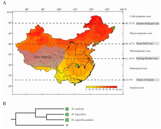 In 1925, Nichols [10] first described and reported the species distribution of the genus Misgurnus in China. Chen and Zhu [11] proposed that the ancestors of genus Misgurnus originated in the Southeast Asia region (north of Wallace’s line), including Kepulauan Sunda Besar, Thailand, Myanmar and south of China (tropical regions), and subsequently radiated into temperate zones via a northern route of expansion, which has been confirmed by Perdices et al. [12,13]. Three species, Misgurnus anguillicaudatus, Misgurnus mohoity, and Misgurnus bipartitus, are distributed throughout China, except on the Tibetan plateau. Misgurnus anguillicaudatus is widely distributed in the middle and lower reaches of the Yangtze River Basin, whereas M. bipartitus is restricted to north of the Yellow River in China, and M. mohoity only occurs in the Amur River Basin in northeast China, Mongolia, and the Far East region of Russia [13,14]. The specific geographical distributions of these three loaches are clearly consistent with the demarcation of temperature zones in China (Figure 1A). Therefore, they provide a rich source of naturally occurring genetic variation within and between species, which can be used to explore biological processes that are important in adaptive evolution. Here, a comprehensive transcriptome analysis of the three species, M. anguillicaudatus, M. bipartitus, and M. mohoity, was undertaken to investigate their evolutionary rates and to identify the genes that may have facilitated the lineage-specific thermal adaptations of these three loach species.